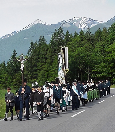 Schon Tradition ist am Christi-Himmelfahrtstag die Dank- und Bittwallfahrt der Trach- tenvereine des Chiemgau-Alpenverbandes nach Raiten. Ihren Anfang nahm sie, als sieben Raitener Männer im Jahre 1951 die Initiative ergriffen und zusammen mit dem Trachtenverein „D ́Gamsgebirgler“ Schleching, den Nachbartrachtenvereinen Unter- wössen, Marquartstein und Piesenhausen sowie mit den Kriegervereinen Schleching, Unterwössen und Marquartstein in Zusammenarbeit mit dem Schlechinger Pfar- rer Eduard Pichler für das Jahr 1952 den ersten „Krieger-Gedächtnis-Gottesdienst“ mit anschliessender Ehrung der gefallenen und vermissten Kameraden des zweiten Weltkrieges planten. Seitdem erleben wir alljährlich den eindrucksvollen Zug mit Ro- senkranzgebet der Chiemgauer Trachtler zunächst von Marquartstein herauf, später von Unterwössen herüber und den Gang der Schlechinger Gamsgebirgler von Schle- ching aus zum Kirchbichl von Raiten. In der langen Zeit seit dem Krieg hat die Wall- fahrt ausser ihrer Bedeutung als „Kriegerwallfahrt“ noch eine andere erlangt: als De- monstration des Heimatgedankens im kirchlich geprägten Raum.