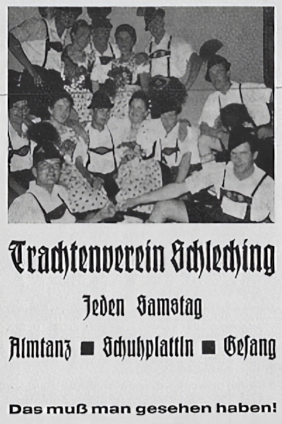 Im Jahr 1955 waren die Schlechinger bereits zum fünften Mal am Oktoberfestzug in München beteiligt, in unregelmäßigen Abständen immer wieder mit Festwagen und Musikkapelle. Wenn auch bis zum Jahre 1969 in Schleching selbst kein festlicher Hö- hepunkt im Trachtenvereinsgeschehen herausragte, so war die Zeit bis dahin den- noch äußerst wichtig und interessant. Man könnte diese Zeit und auch die Jahre dar- über hinaus bezeichnen als die Jahre einerseits der Konsolidierung, andererseits der Auseinandersetzung um Traditionen und der Kämpfe gegen den Zeitgeist, aber auch die Jahre der Kompromisse und notwendigen Anpassungen an die Zeit, schließlich auch die Jahre der Renaissance, der Wiederbelebung in den Bereichen Musik, Ge- sang, Tanz, Theaterspielen und als Zeit der Wiederbeachtung des Althergebrachten.